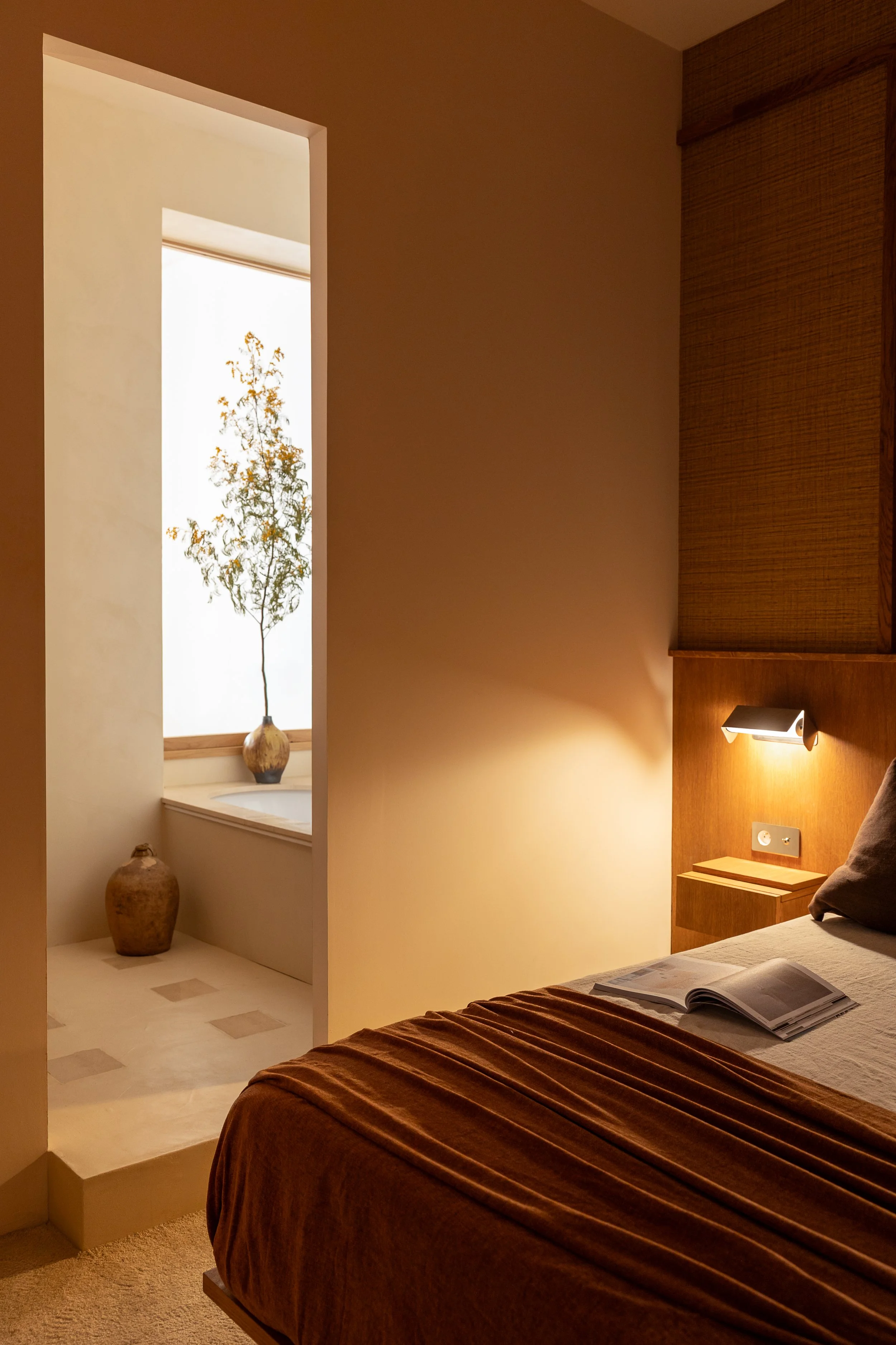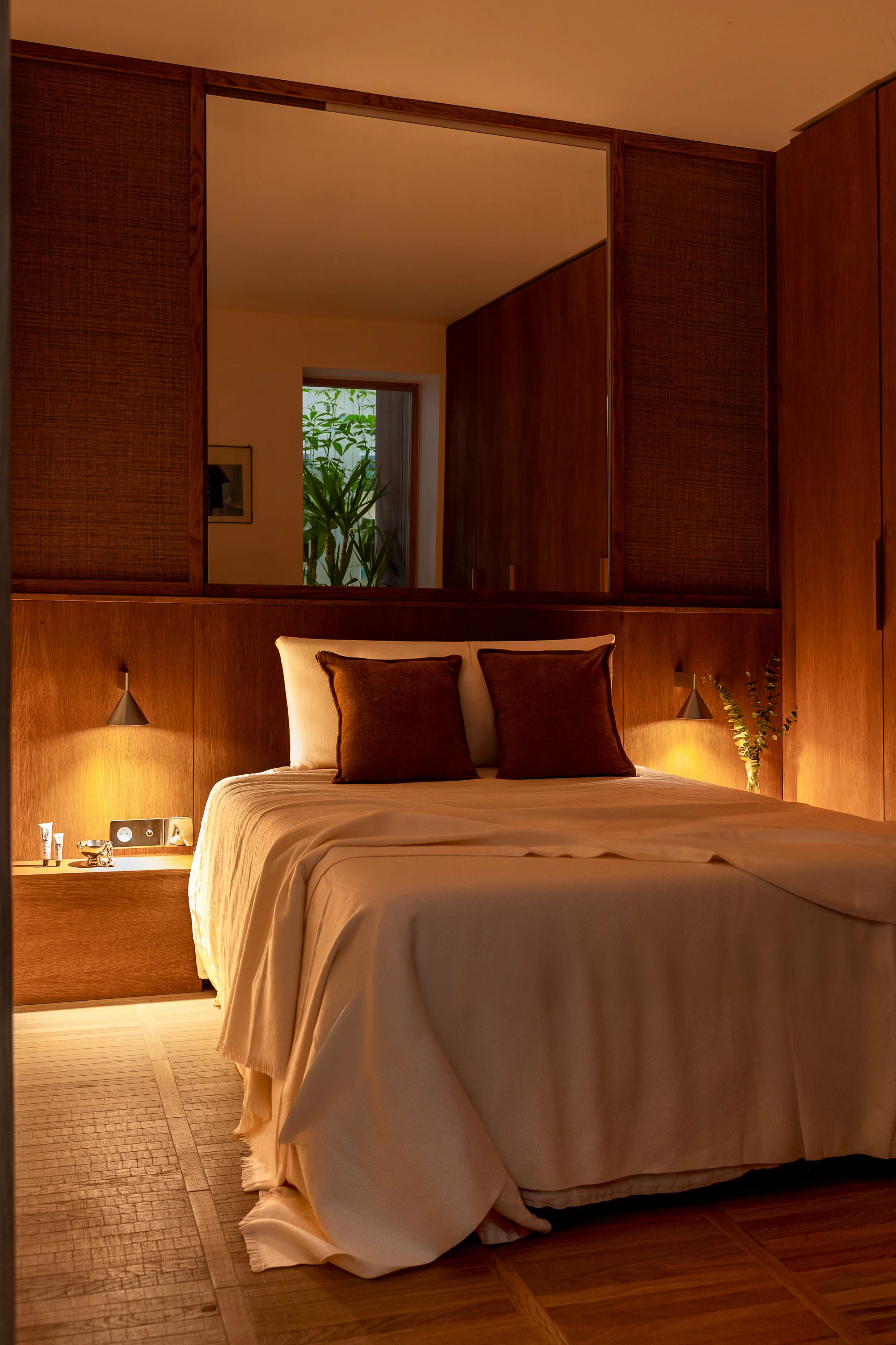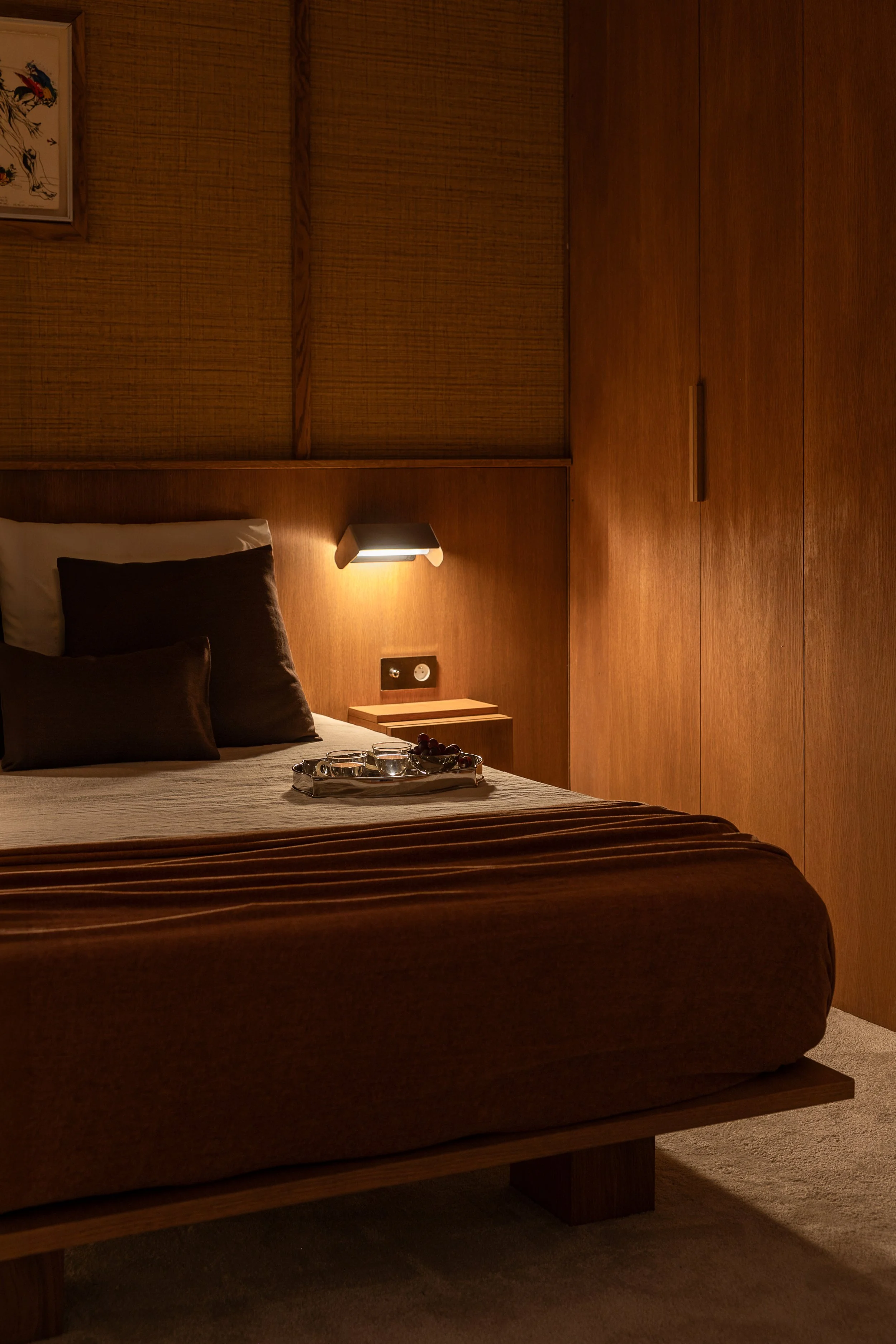 La cuisine joue un contraste net entre l'îlot en inox brossé et les rangements en chêne massif. Dans les chambres, des panneaux de papier peint végétal tendus dans une ossature de tasseaux tapissent l'espace du sol au plafond. Le chêne court partout, placards, chevets, cadre de lit, et la lumière, basse et rasante, fait le reste. Les salles de bains suivent la même logique d'enveloppement : béton ciré sur-mesure beige, miroirs encadrés de chêne, robinetterie chromée comme seul éclat.