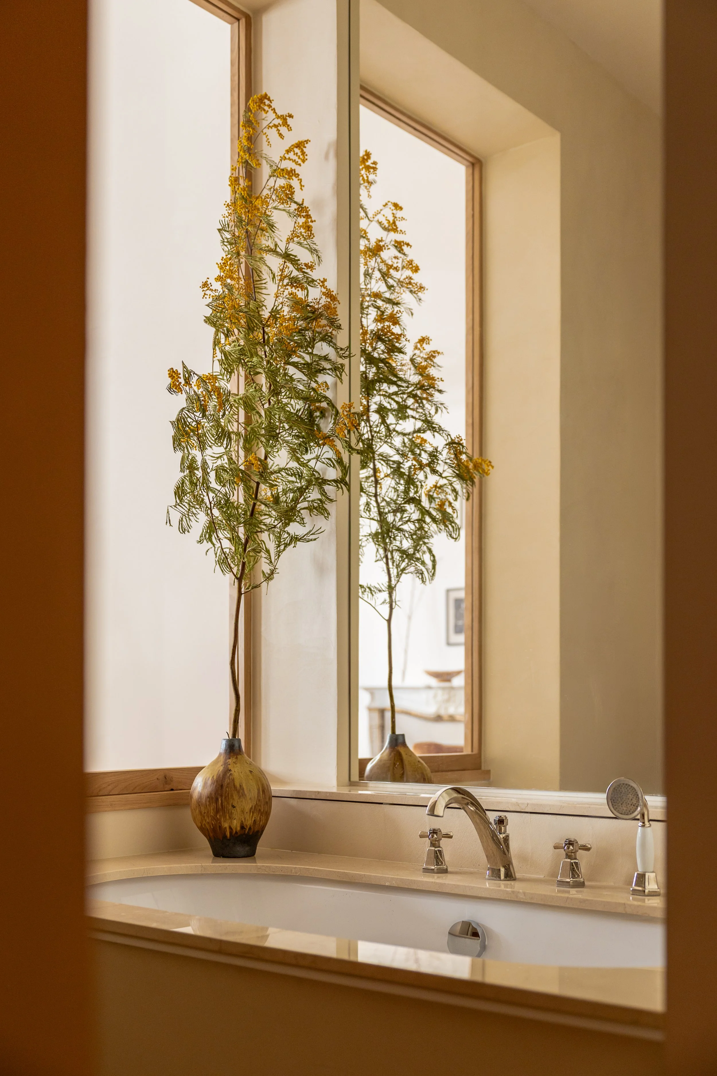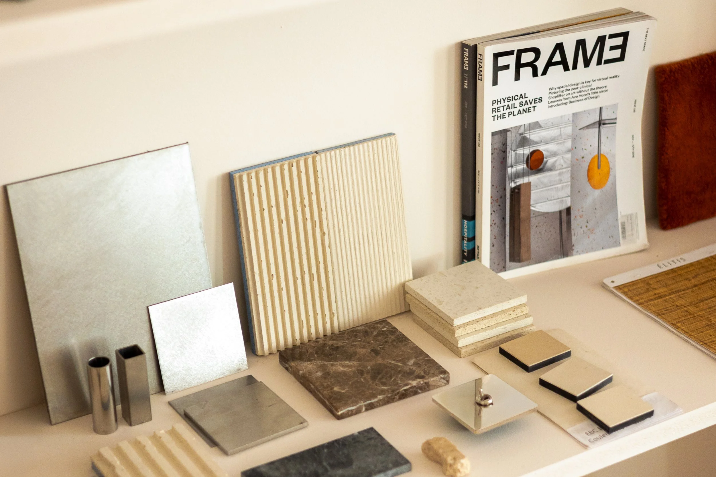 Le salon, c'est aussi là où les projets commencent. Sur les étagères, les échantillons de bois, de pierre et de tissu voisinent avec les livres d'art, les céramiques, les objets trouvés. Les planches d'intention s'appuient contre le mur, les plans se déploient sur la grande table en chêne. C'est un lieu de travail qui ne ressemble pas à un bureau, plutôt un endroit où les idées se forment au contact des choses, entre une conversation et un café.