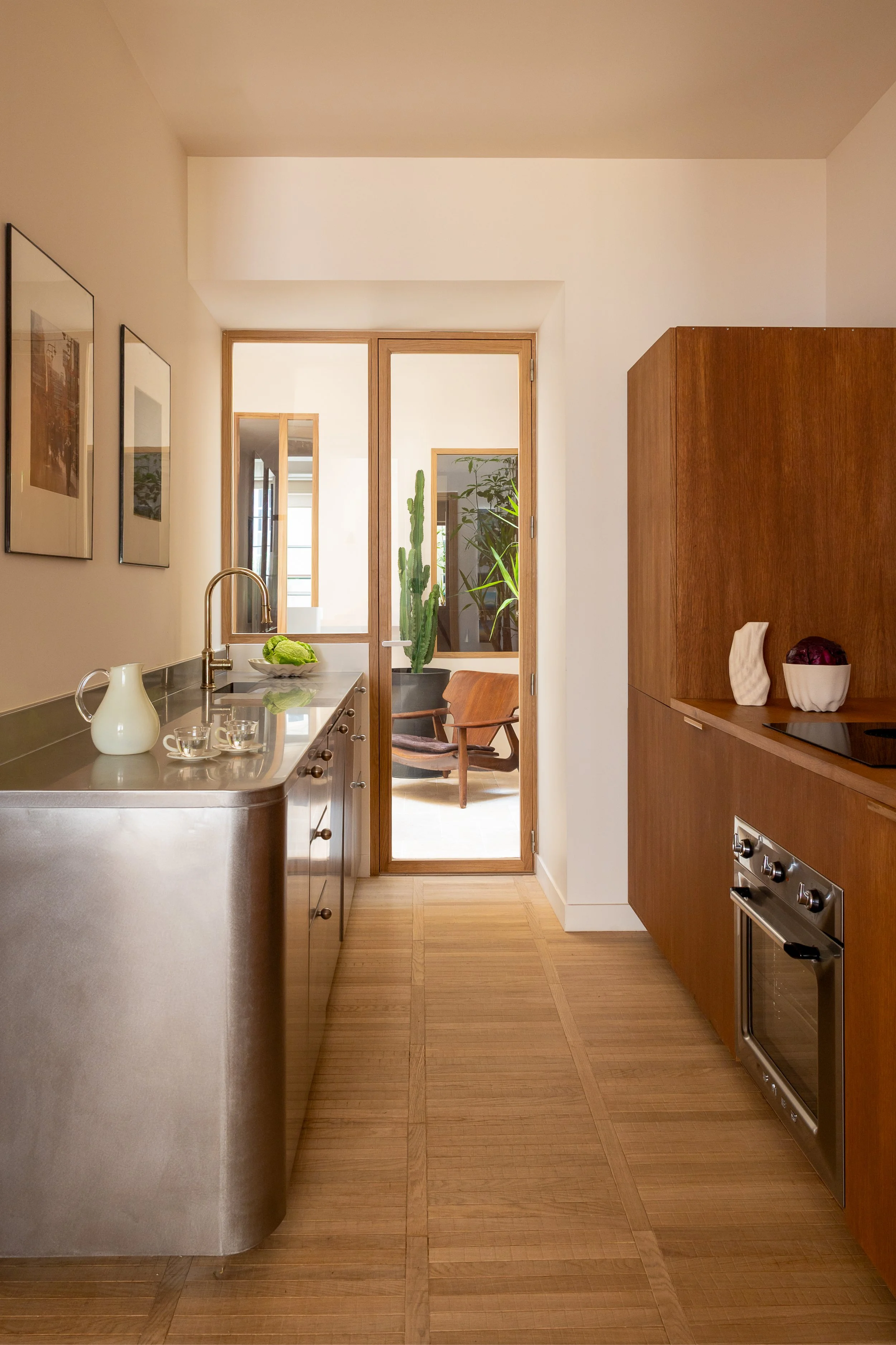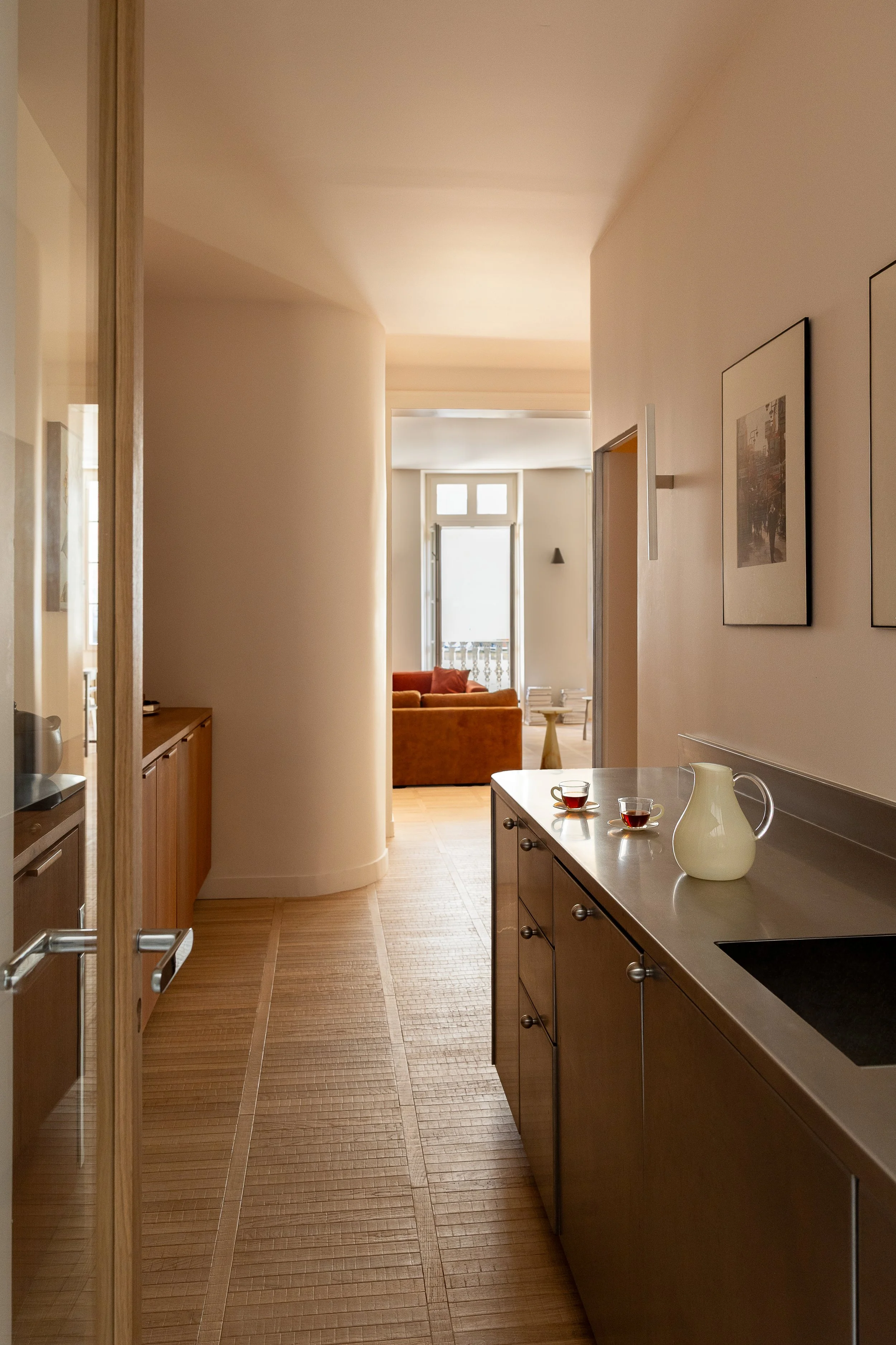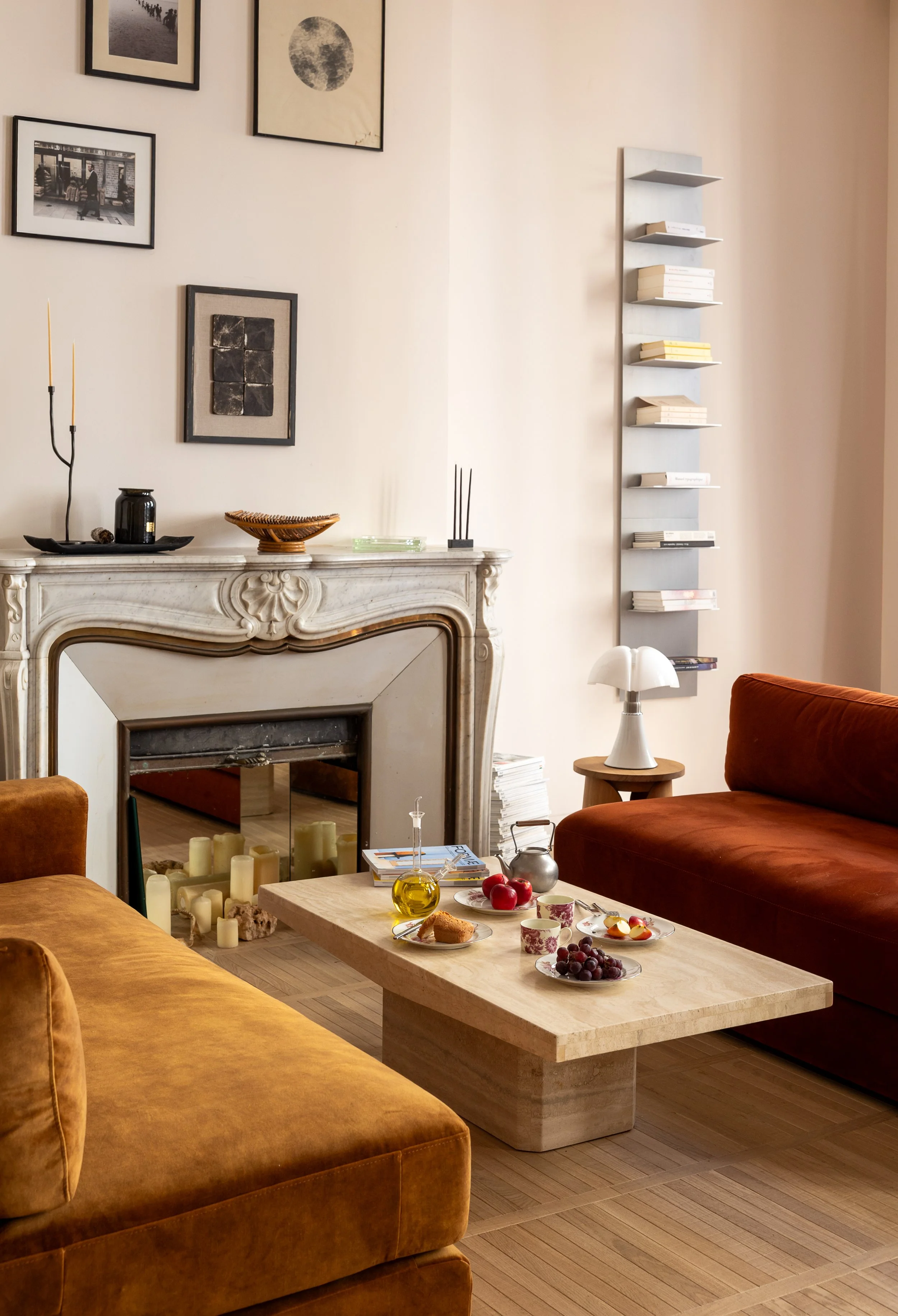 L'appartement conserve sa structure haussmannienne mais chaque surface a été repensée. Les murs, peints dans un blanc crème, unifie les pièces et laisse toute la place à la lumière naturelle et aux matériaux. Le parquet, posé en calepinage serré, donne au sol un grain presque textile.
