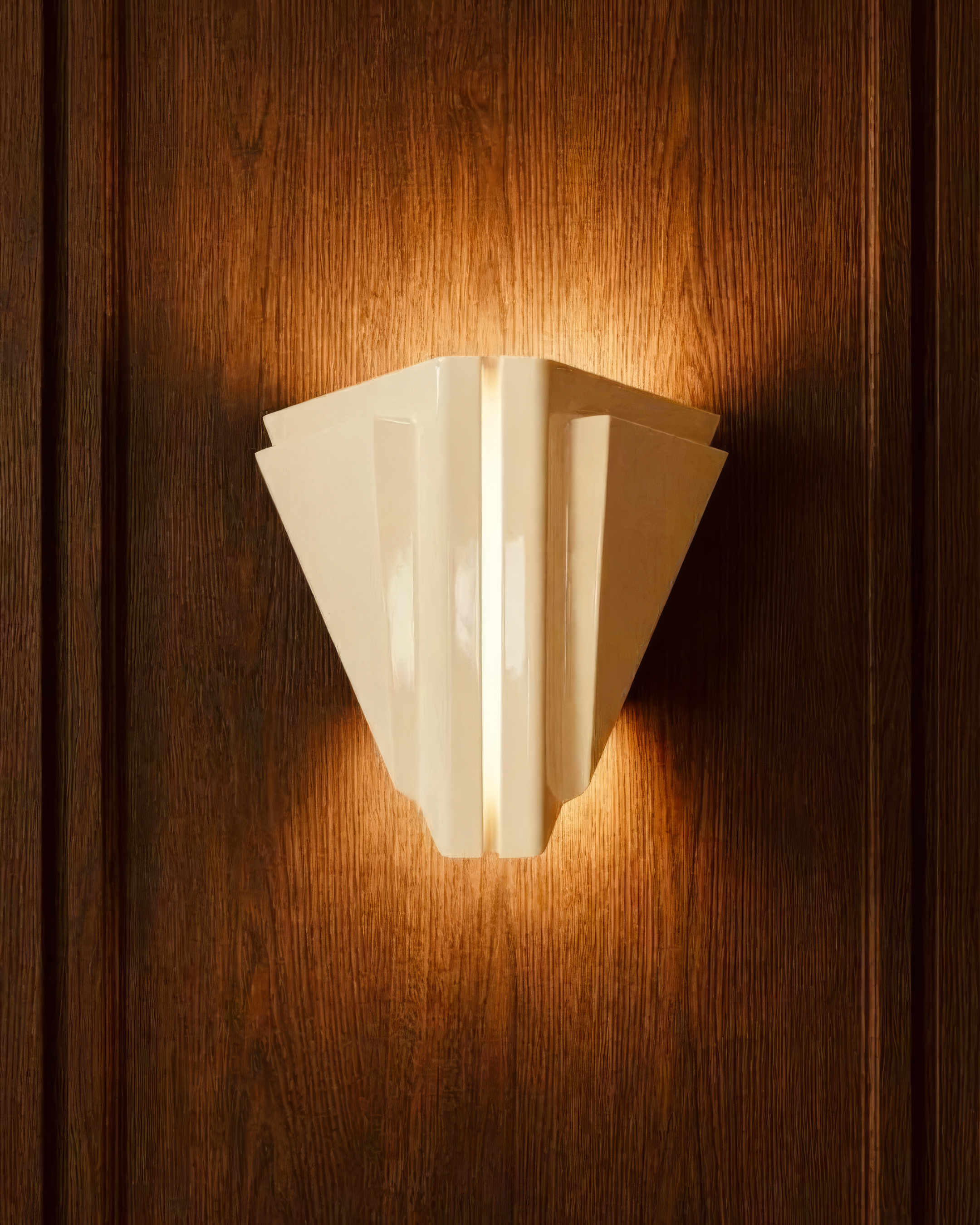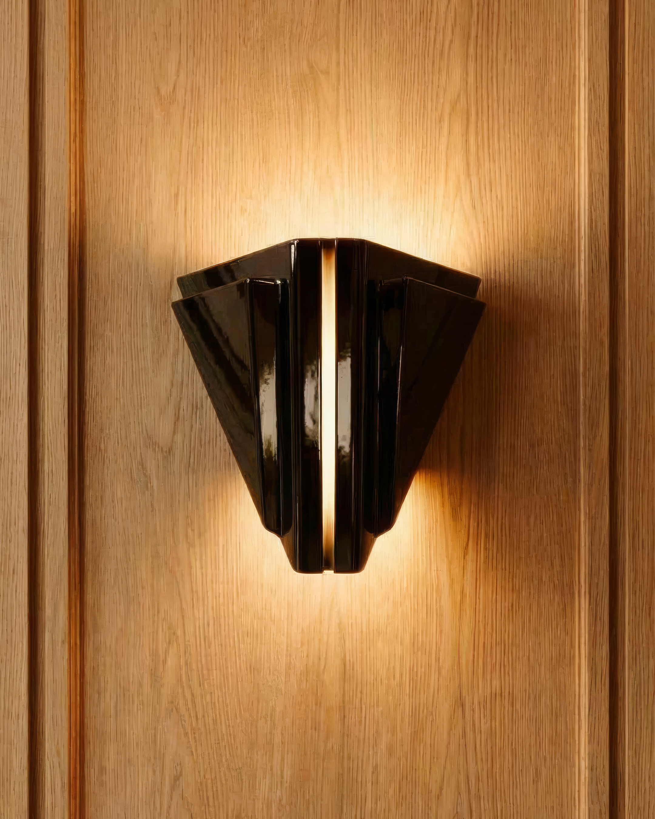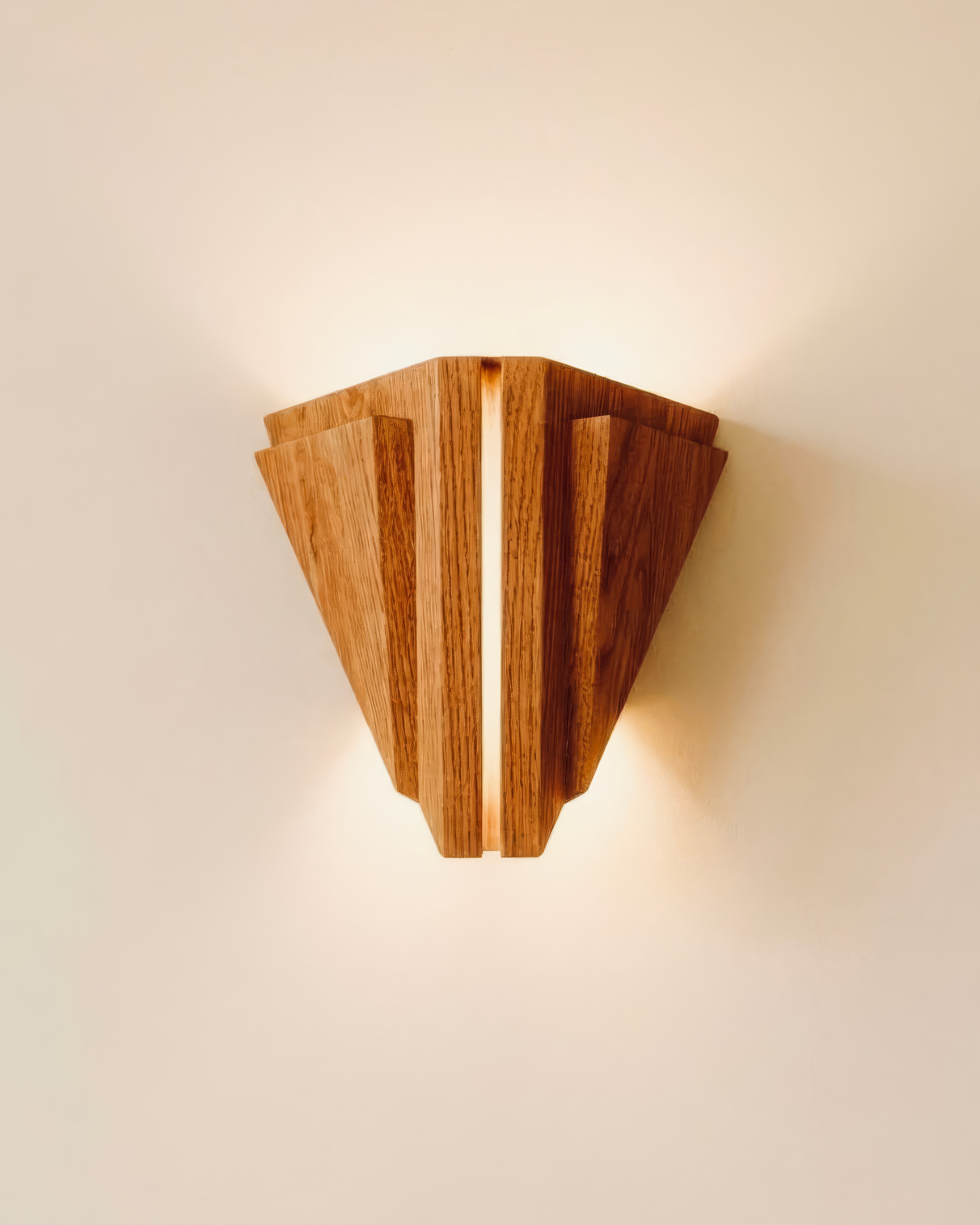 La forme en biseau ascendant est travaillée par la surépaisseur et le joint creux : les plans se décalent légèrement, créant des lignes d’ombre qui animent la surface et révèlent la construction. La lumière diffusée, indirecte et chaude, sculpte le mur.