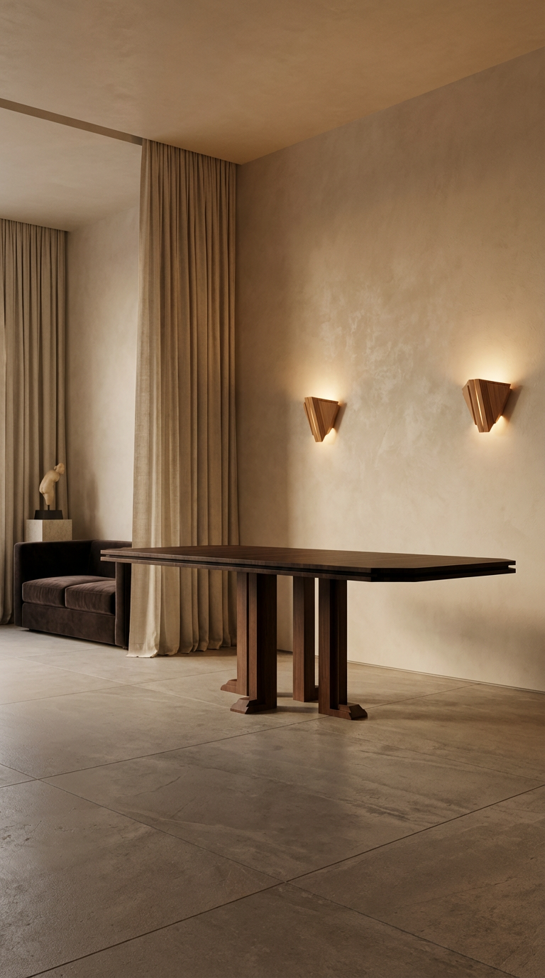 Ce débord est creusé d'un joint creux continu : une ligne d'ombre fine qui détache visuellement la masse du plateau de sa propre épaisseur, comme Brancusi séparait l'œuvre du socle pour mieux affirmer l'un et l'autre. Les pieds en bois mat, à géométrie carrée et section généreuse, reprennent ce même vocabulaire de la masse et du retrait.