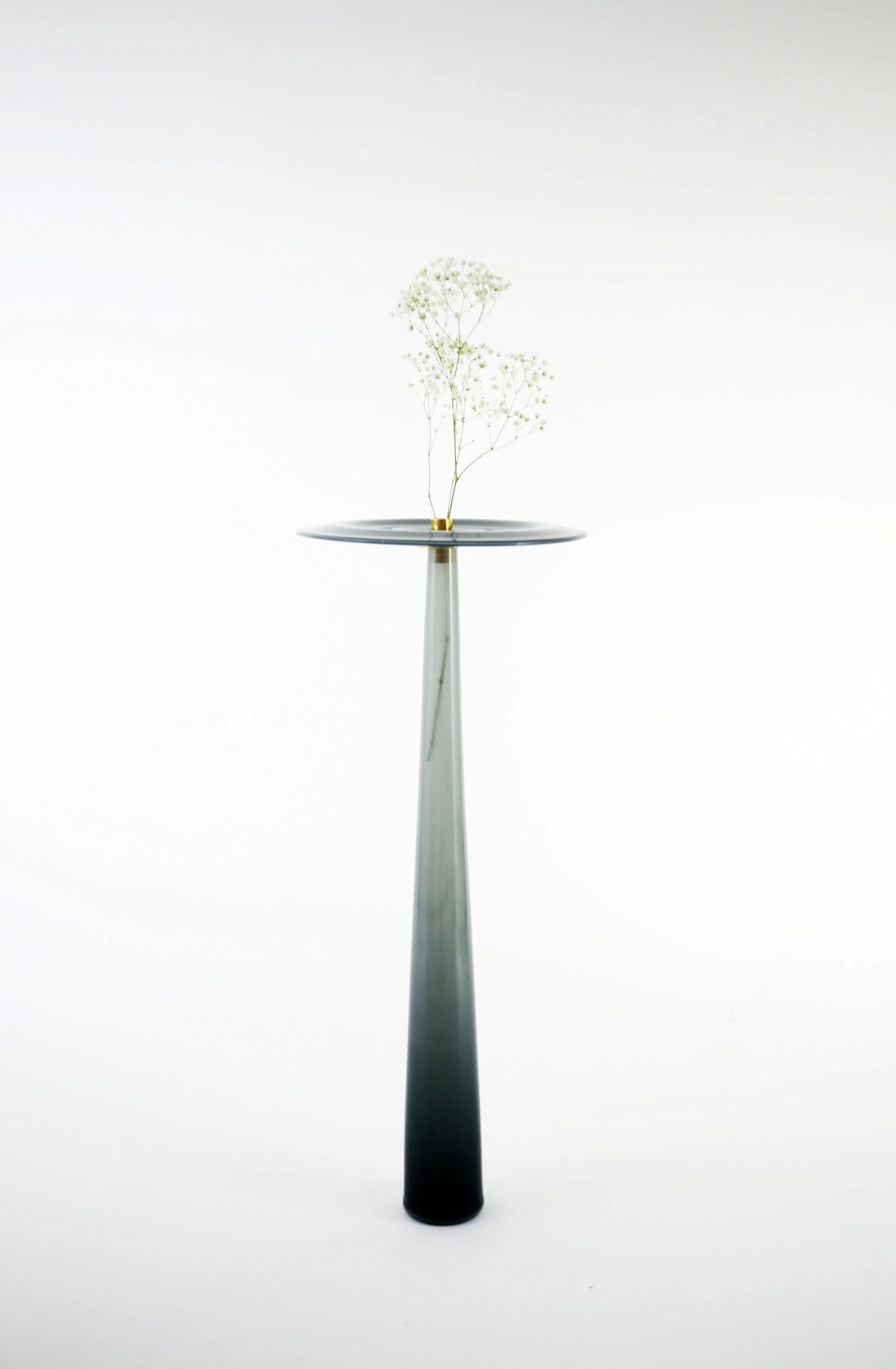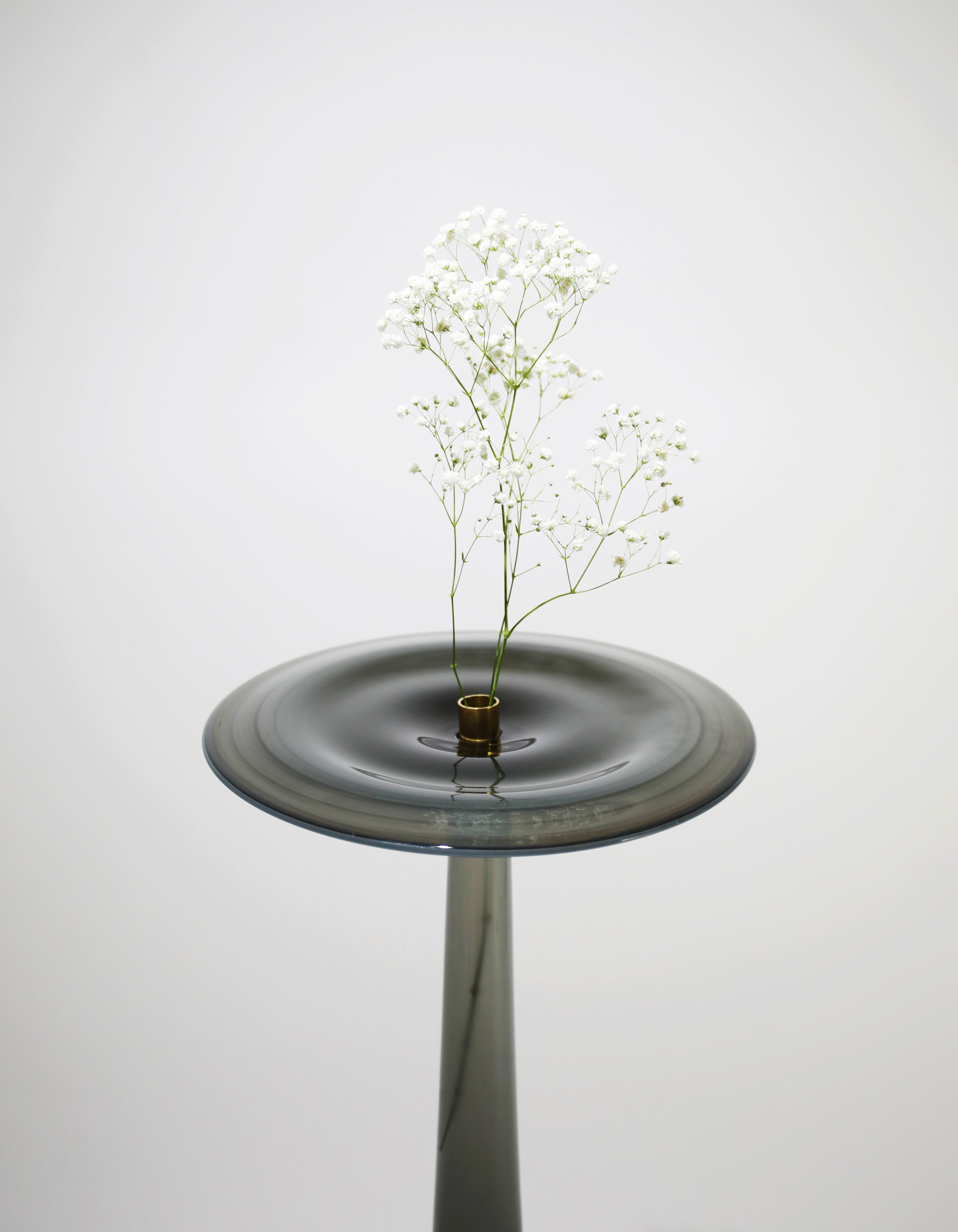 Ce moment précis devient ici un geste figé dans le verre. Le plateau circulaire évoque l’onde qui se propage, douce et concentrique, tandis que la tige élancée agit comme une colonne fluide, presque liquide, reliant la matière au vide.