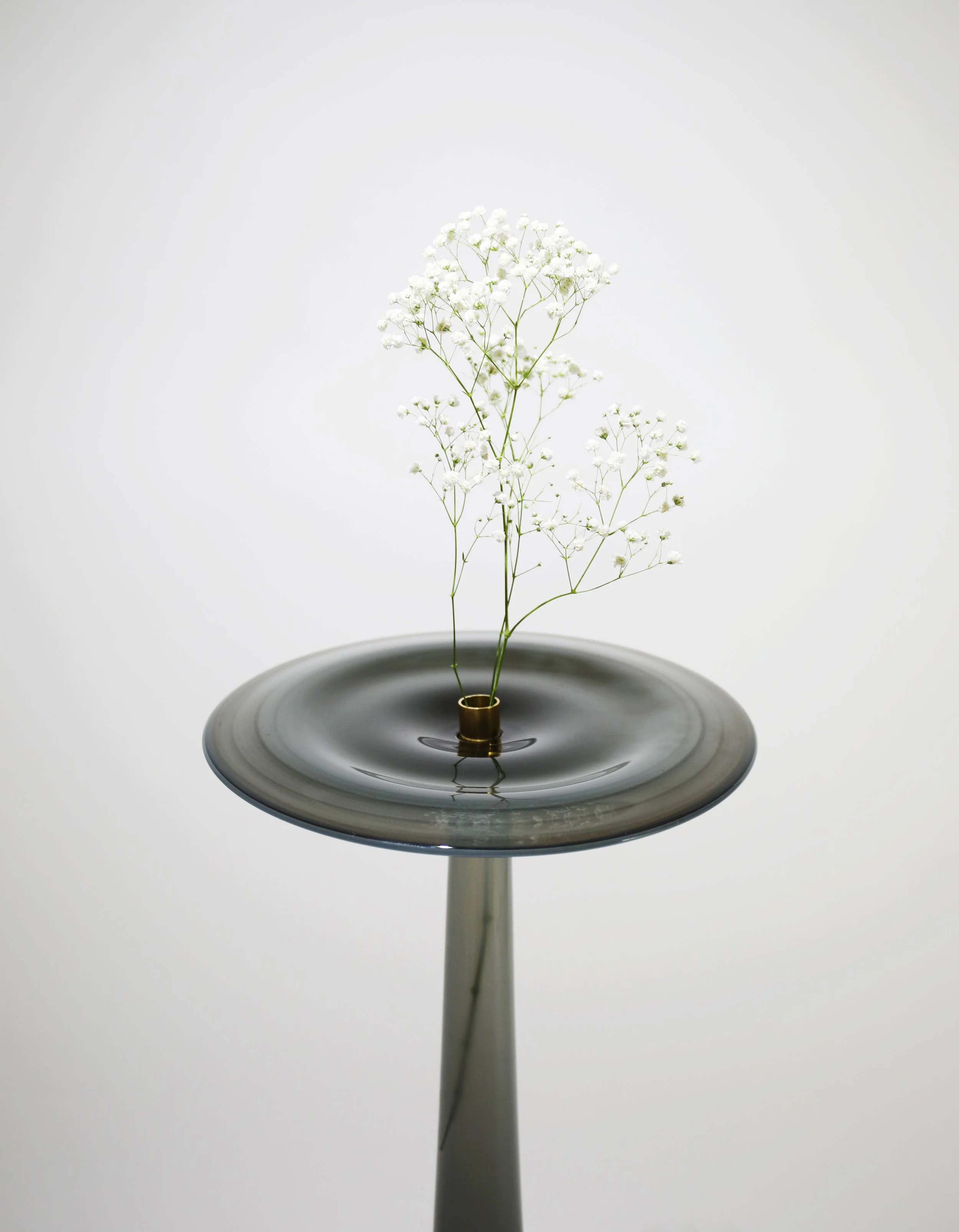 Ce moment précis devient ici un geste figé dans le verre. Le plateau circulaire évoque l’onde qui se propage, douce et concentrique, tandis que la tige élancée agit comme une colonne fluide, presque liquide, reliant la matière au vide.